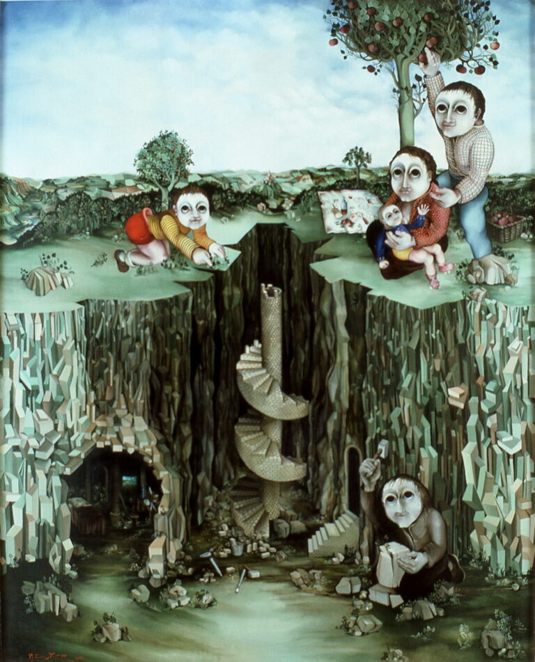L’Évasion se divise en deux parties très différentes. La partie inférieure montre un environnement minéral et austère, entouré des parois d’une falaise abrupte. Une personne, qui semble être une femme et pourrait être Martine elle-même, est agenouillée. Sourire aux lèvres, elle débite une grosse pierre en petits blocs parallélépipédiques pour construire un solide escalier en colimaçon. Elle vit dans une caverne et souhaite s’en échapper pour atteindre le niveau supérieur où la vie est plus douce. Là-haut, une famille pique-nique sous un arbre garni de fruits et un village perché est éclairé par la lumière d’un beau soleil. Au bord de la falaise, un petit garçon intrigué montre du doigt la travailleuse.